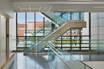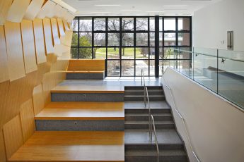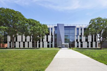The School of Business at Farmingdale State College embodies the institution’s evolution from agricultural roots to a hub of applied science and technology. This three-story structure redefines the campus’s main quadrangle, restoring coherence to its academic core. The building’s distinctive façade introduces an energetic, contemporary design, while respecting the established contextual campus design, blending modern materials with traditional campus architecture. Inside, the design prioritizes collaborative learning and community engagement, with a central atrium that doubles as an event space and gathering area, an integrated amphitheatre that creates an informal social hub, and classrooms configured to encourage interactive learning, with faculty offices strategically positioned to foster spontaneous student-educator interactions.
