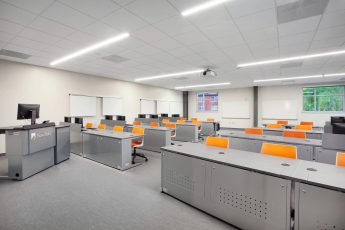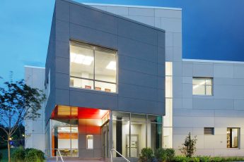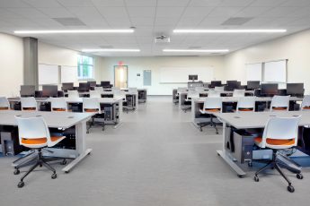 Architecturally, the building strikes a balance between form and function, creating a new “Engineering Plaza” in harmony with the existing Resnick Hall. Its contemporary design features a rectilinear volume with a cleverly skewed mid-section, forming an inviting lobby entrance. The structure’s varying floor footprints allow for eastern roof terraces, while a thoughtfully designed main entrance, set back under a column-supported overhang, elegantly sidesteps the need for costly utility relocations. The exterior seamlessly blends traditional materials such as brick and slate with modern zinc and metal shading devices, creating a visually striking yet contextual façade.